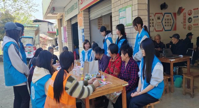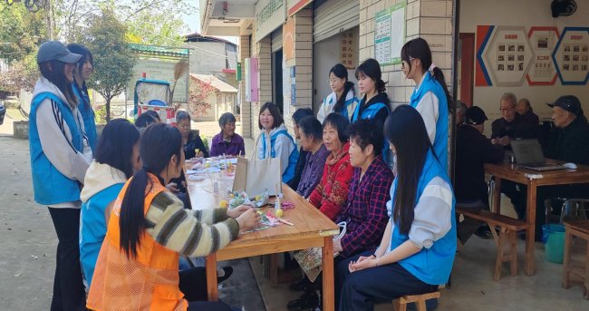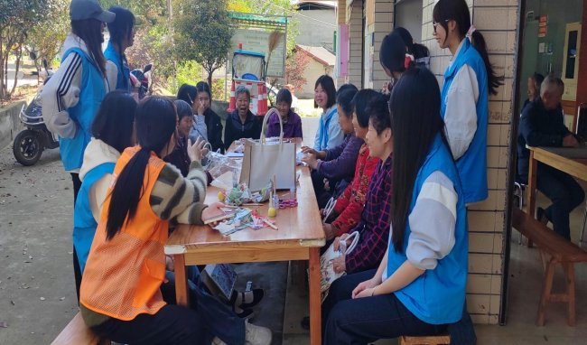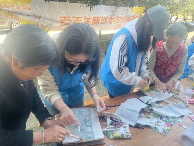 大学生志愿者与老人共同制作手工巴特包